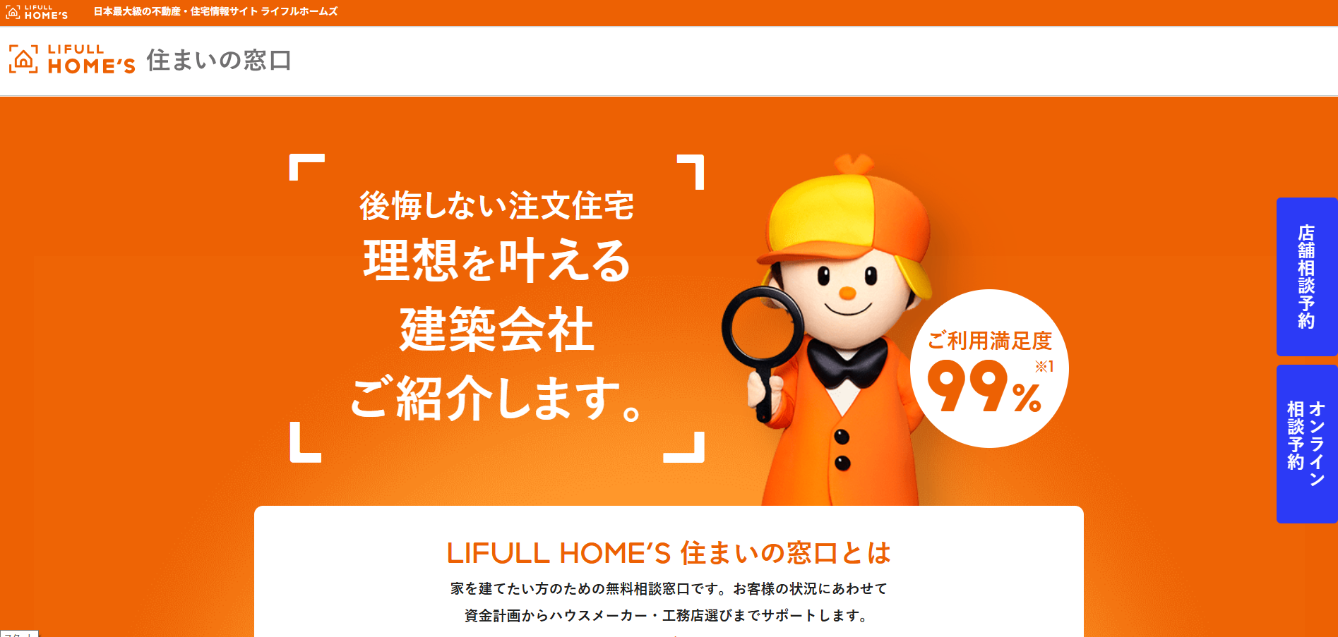 ご利用満足度も99.5%と多くのお客様に満足いただいています。(集計期間:2019年4月~2020年3月) 注文住宅、建売住宅(新築・中古ともに)、マンション(新築・中古ともに)、 リノベーションなど物件種別を問わず幅広く相談できる点、また店舗相談だけでなく ビデオ通話相談にも対応している点が他サービスと比較した際の優位性です。