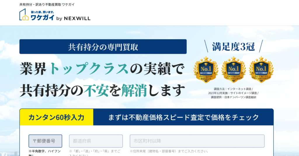 ワケガイを運営している株式会社ネクスウィルは、空き家や、再建築不可、共有で所有している不動産などの管理、所有でお困りの方へに向けた専門サービスを運営している不動産会社です。法的知識や専門知識を持ったスタッフが再度市場に流通させることを目的とした、不動産買取りを行っている会社です。