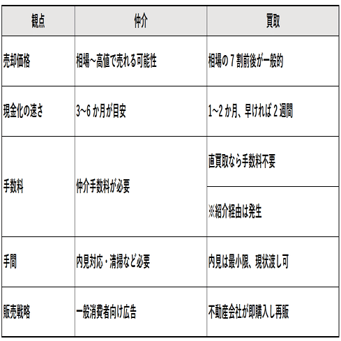 - 仲介=ネットオークション:高値で売れるが時間がかかる。