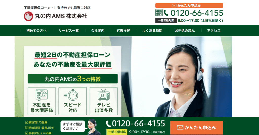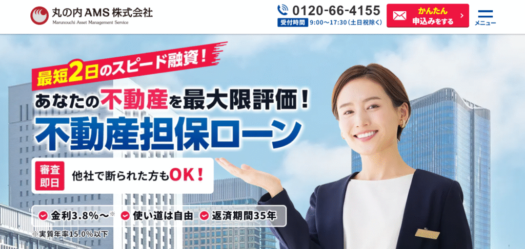 丸の内AMSは一都三県を営業エリアにしている金融機関(ノンバンク)です。 審査・融資がスピーディです。 審査は最短当日から、融資実行は最短2日から可能です。もちろん審査は無料です。