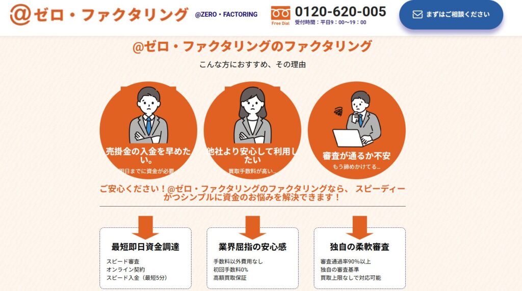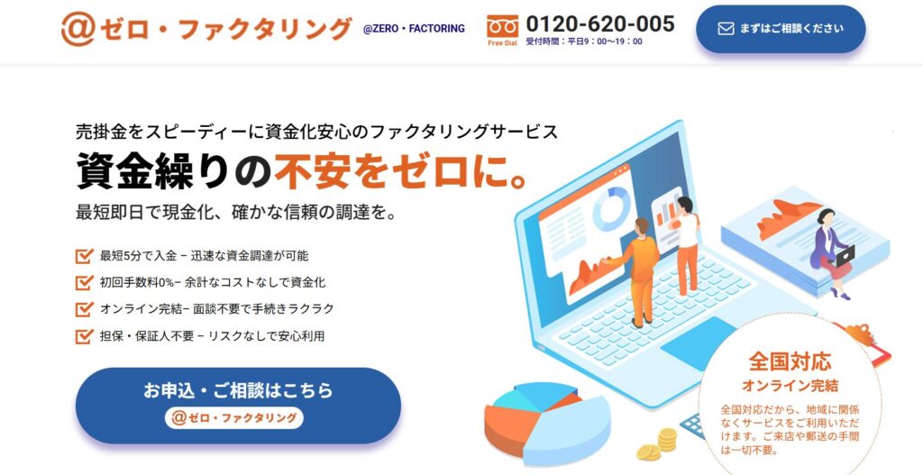 「ゼロファクタリング」は、面倒な手続きや来店不要で スピーディーに資金調達が可能なオンライン完結型のファクタリングサービスです。