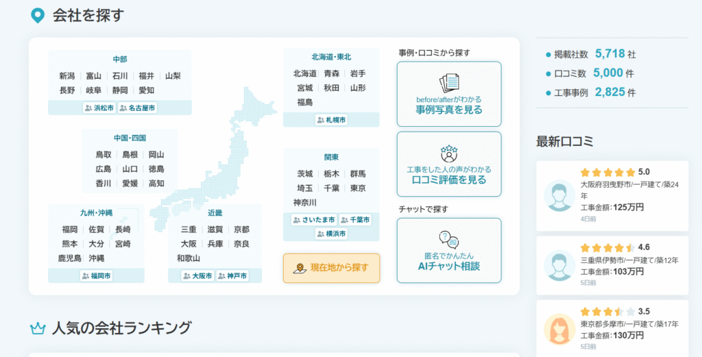 全国のリフォーム会社を紹介してくれるため、エリアに限定せずにリフォーム会社を探す事ができます。なかなか自分の住む地域で希望のリフォーム会社が見つからない際に相談してみても良いでしょう。