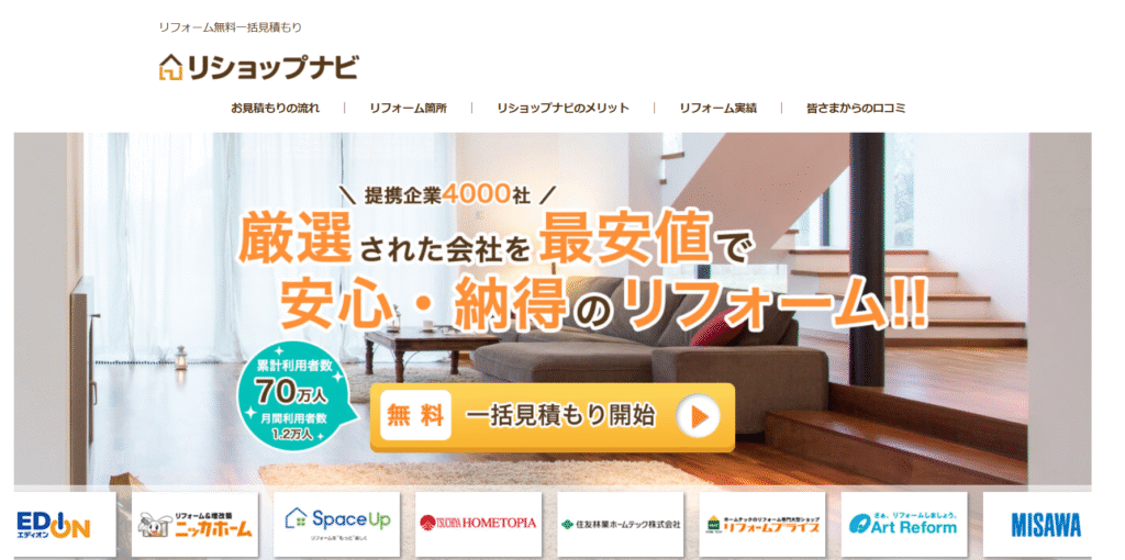 リフォーム会社によって施工スケジュールや使用材料も異なるため、リショップナビを使い、 大手企業から地域の優良会社までまとめて比較できますので、 工事内容によっては数十万円以上節約出来る場合もありメリットは非常に大きいです。