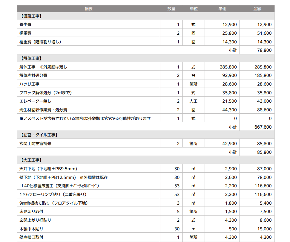| 下地材 | 大工工事に必要な木材、石膏ボード等の材料費 |